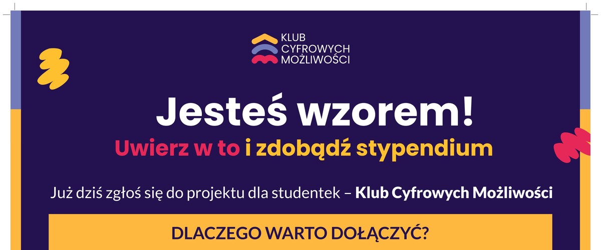 W imieniu Państwowego Instytutu Badawczego NASK oraz Stowarzyszenia Cyfrowy Dialog serdecznie zapraszamy studentki min. 2 roku studiów kierunków ICT* do udziału w projekcie Klub Cyfrowych Możliwości i uzyskania stypendium NASK. Projekt jest realizowany w ramach Funduszy Europejskich na rzecz Rozwoju Społecznego.